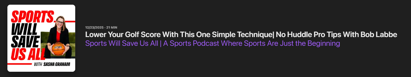 Learn a proven, science-based approach to improve your lag putting, two-putt more consistently, and shave strokes off your score. In this quick, 21-minute episode of Sports Will Save Us All, host Sasha Graham chats with golf putting expert Bob Labbe (author of Putting by the Numbers) about mastering green speed, understanding lag putting, and turning frustration into confidence on every course — fast or slow.